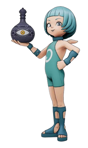 Muniel is short, with blue bowl cut hairstyle. his appearance does look like a young boy, when he is quite older, due to being an Angel. He wears a blue body tight clothes save for his shoulders, sleeves and back with the symbol as a Second Rate Angel. He wears sandal that goes up towards his knees.